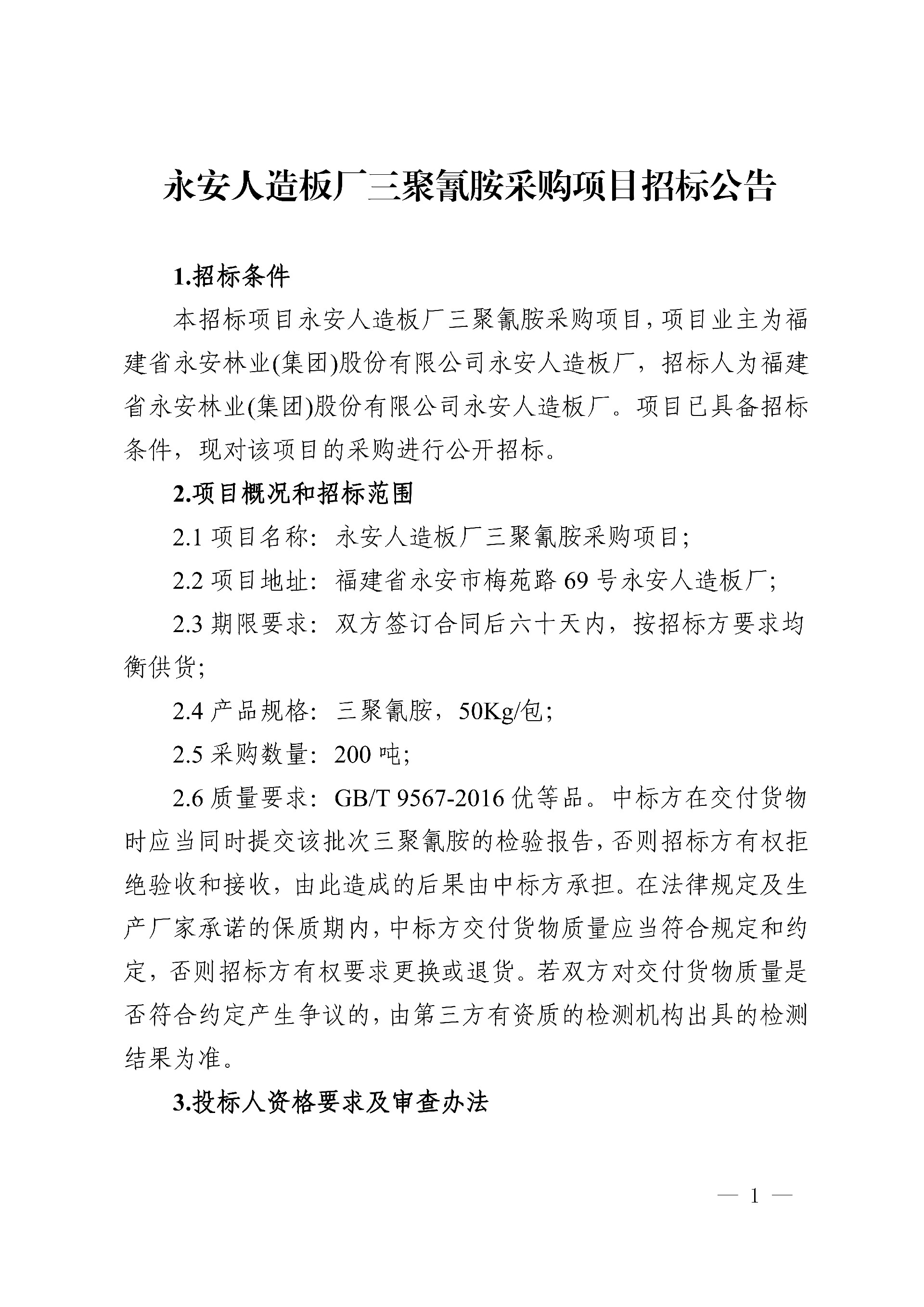 永安人造板廠三聚氰胺采購項(xiàng)目招標(biāo)公告