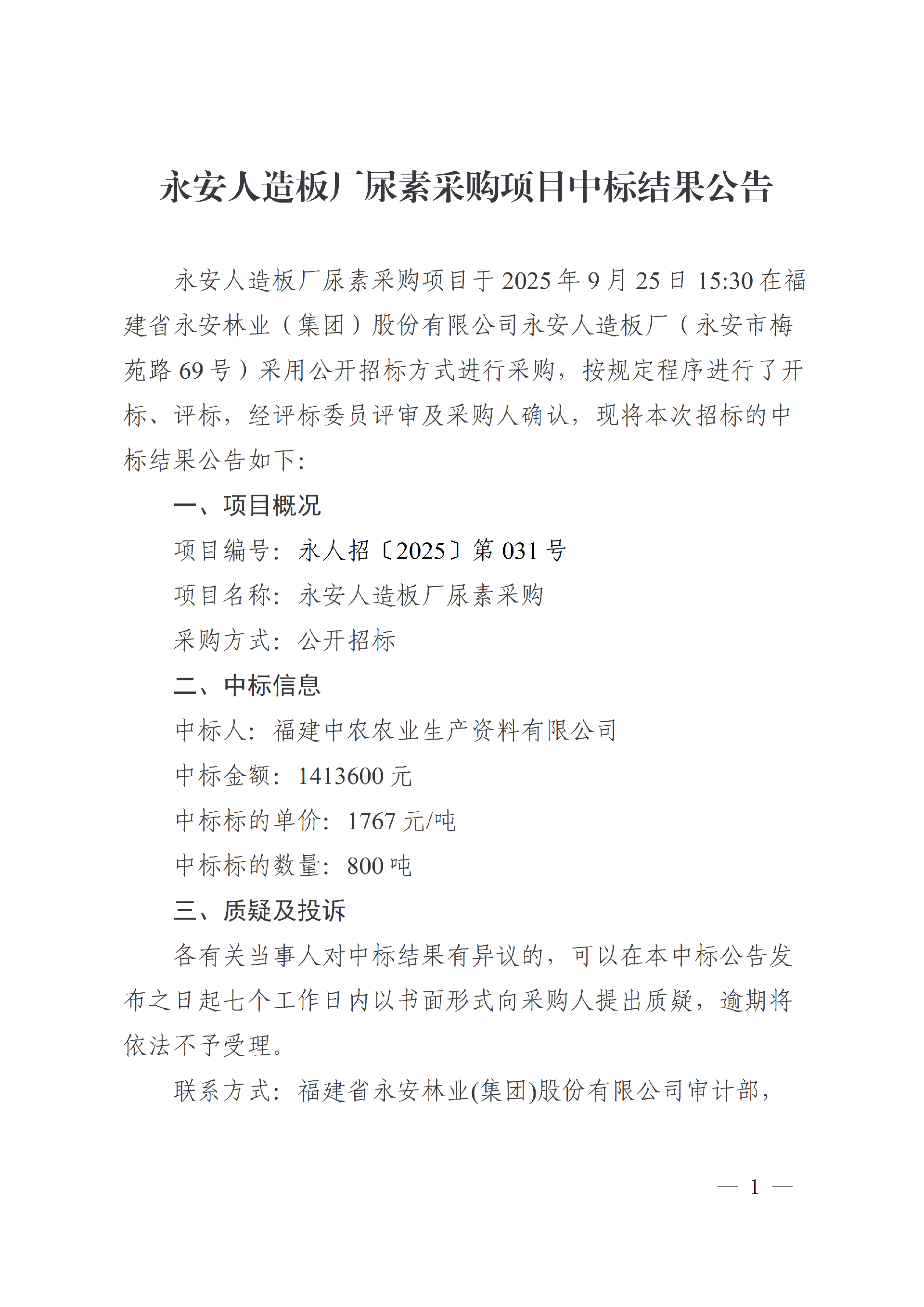 永安人造板廠尿素采購項(xiàng)目中標(biāo)結(jié)果公告