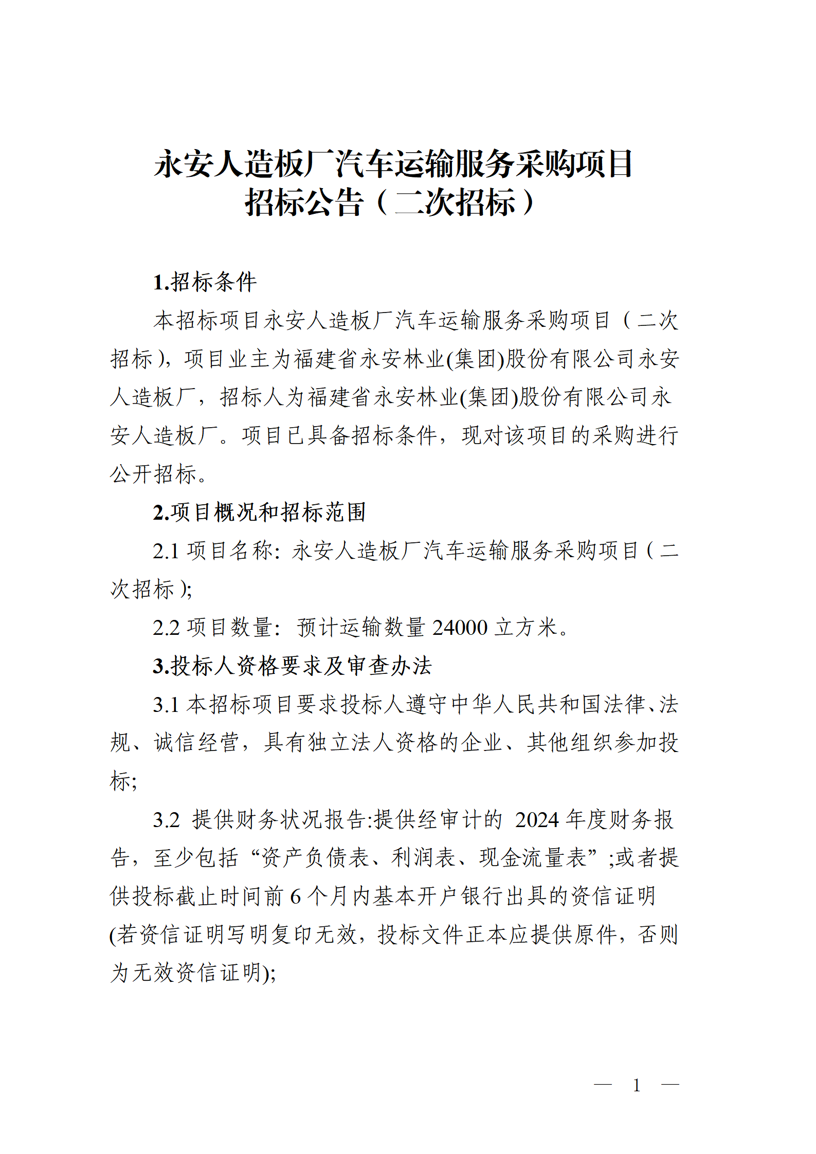 永安人造板廠汽車運輸服務(wù)采購項目招標(biāo)公告(二次招標(biāo))