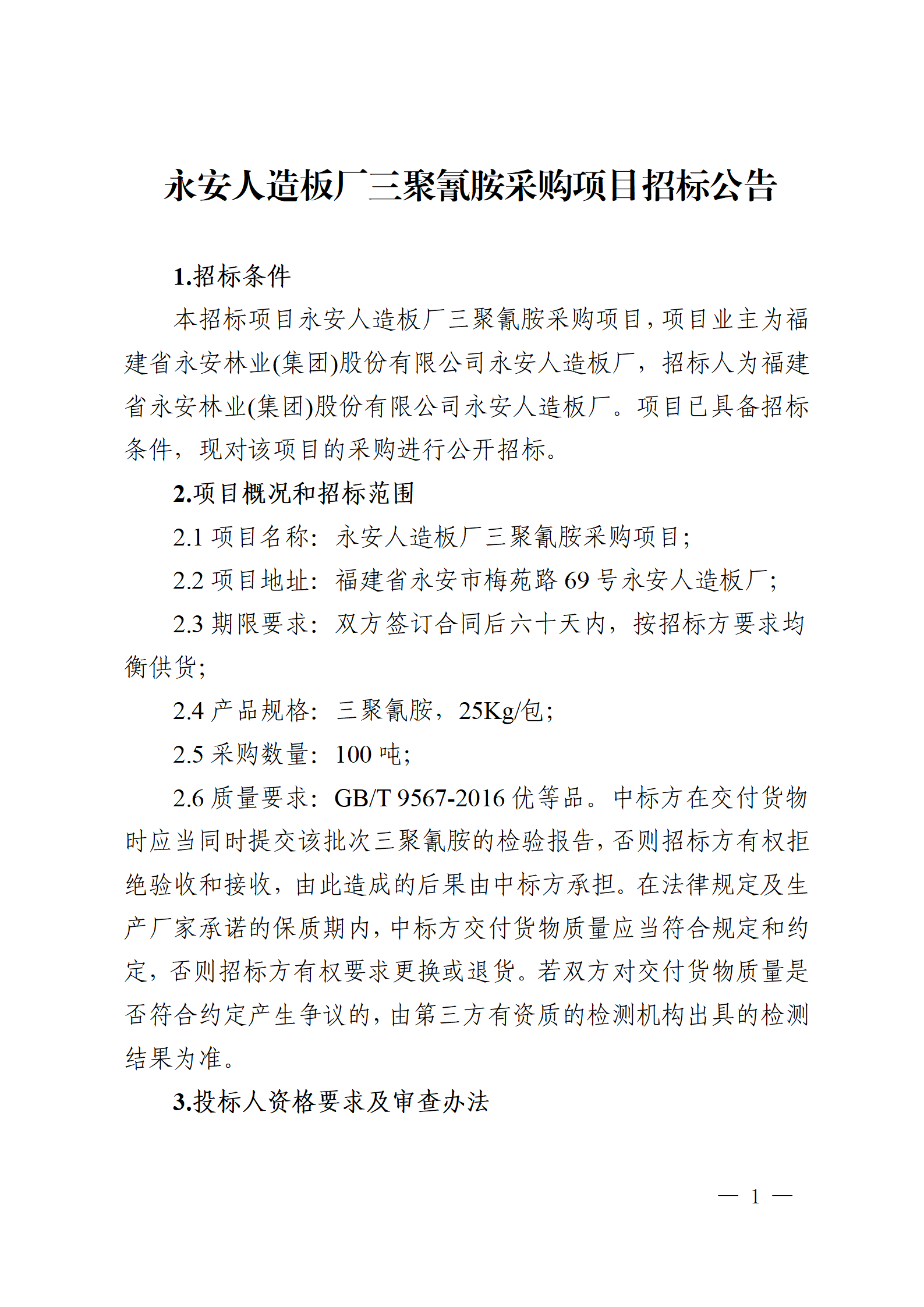 永安人造板廠三聚氰胺采購項(xiàng)目招標(biāo)公告