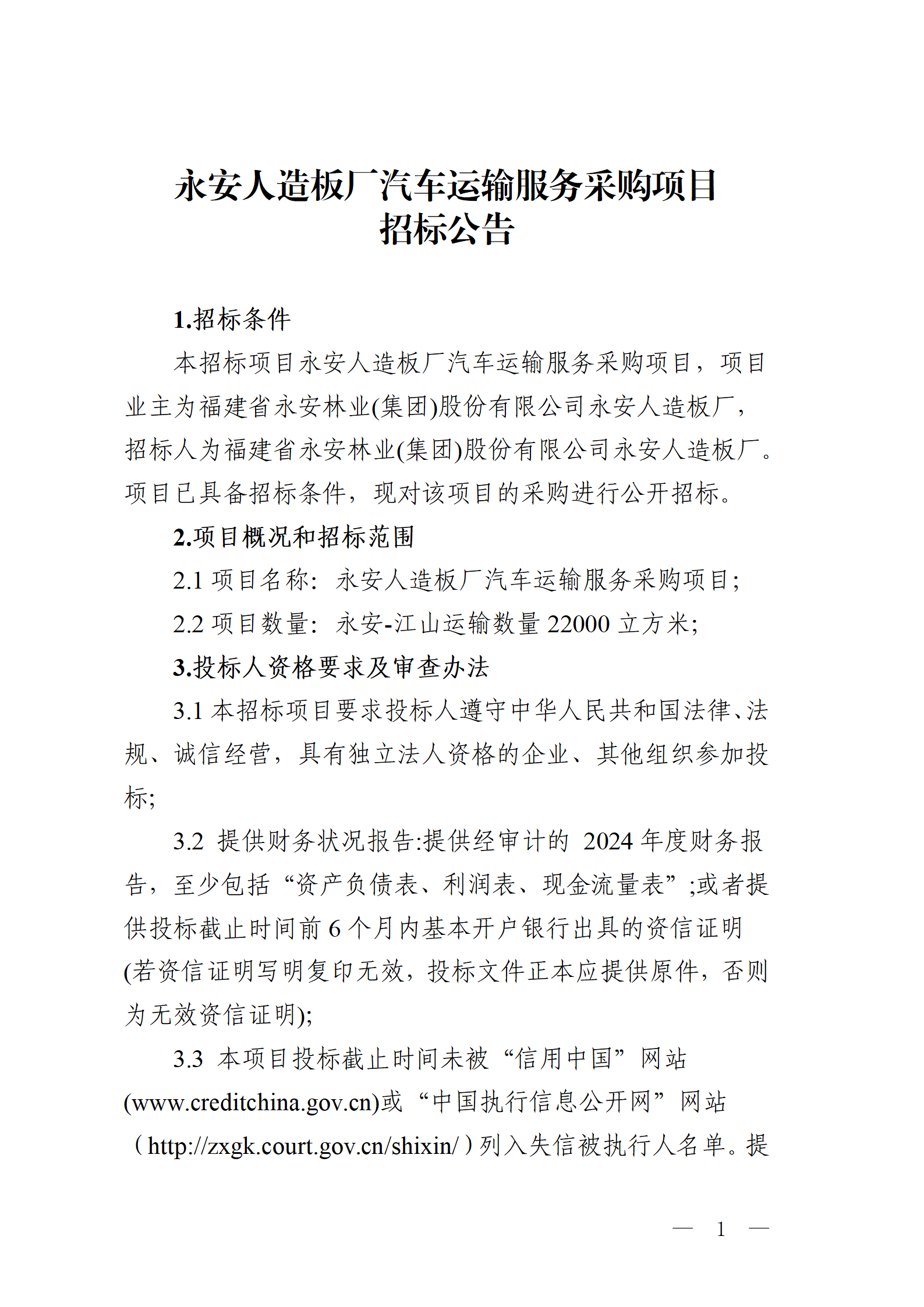 永安人造板廠汽車運輸服務(wù)采購項目招標(biāo)公告