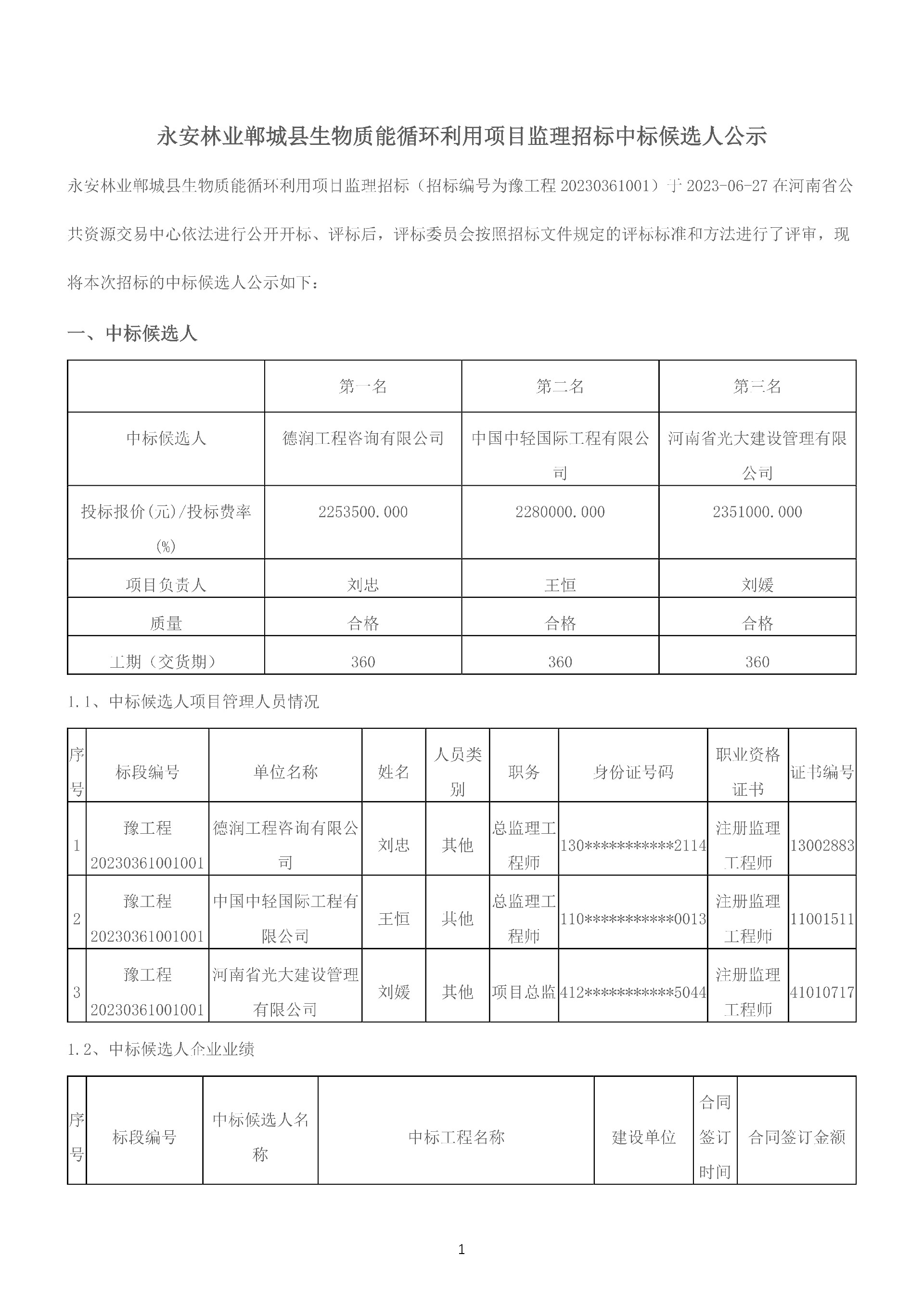 永安林業(yè)鄲城縣生物質(zhì)能循環(huán)利用項(xiàng)目監(jiān)理招標(biāo)中標(biāo)候選人公示