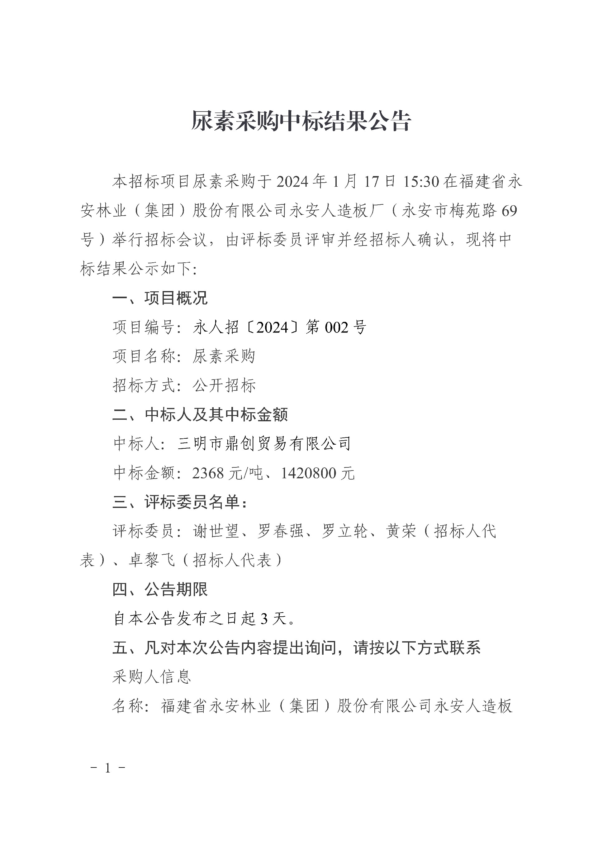 永安人造板廠尿素采購項目中標結(jié)果公告